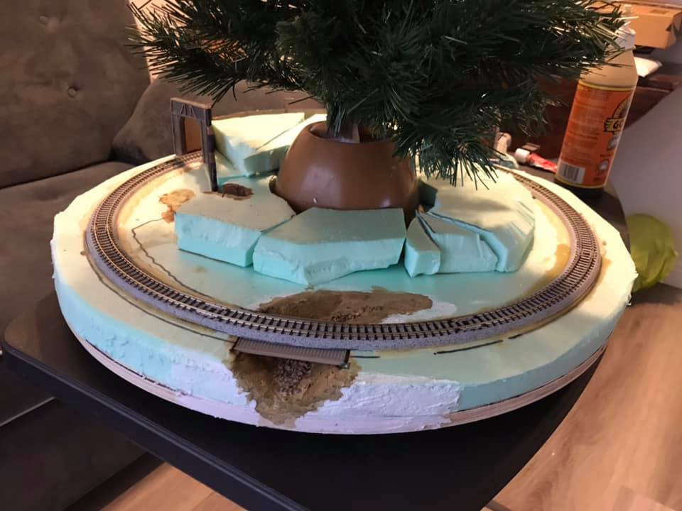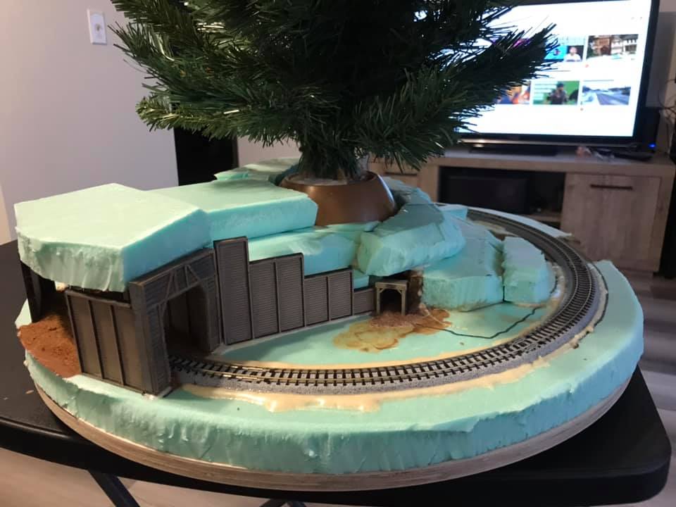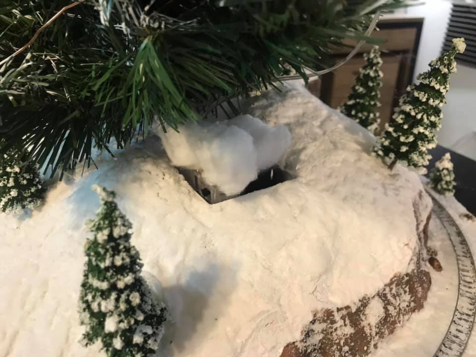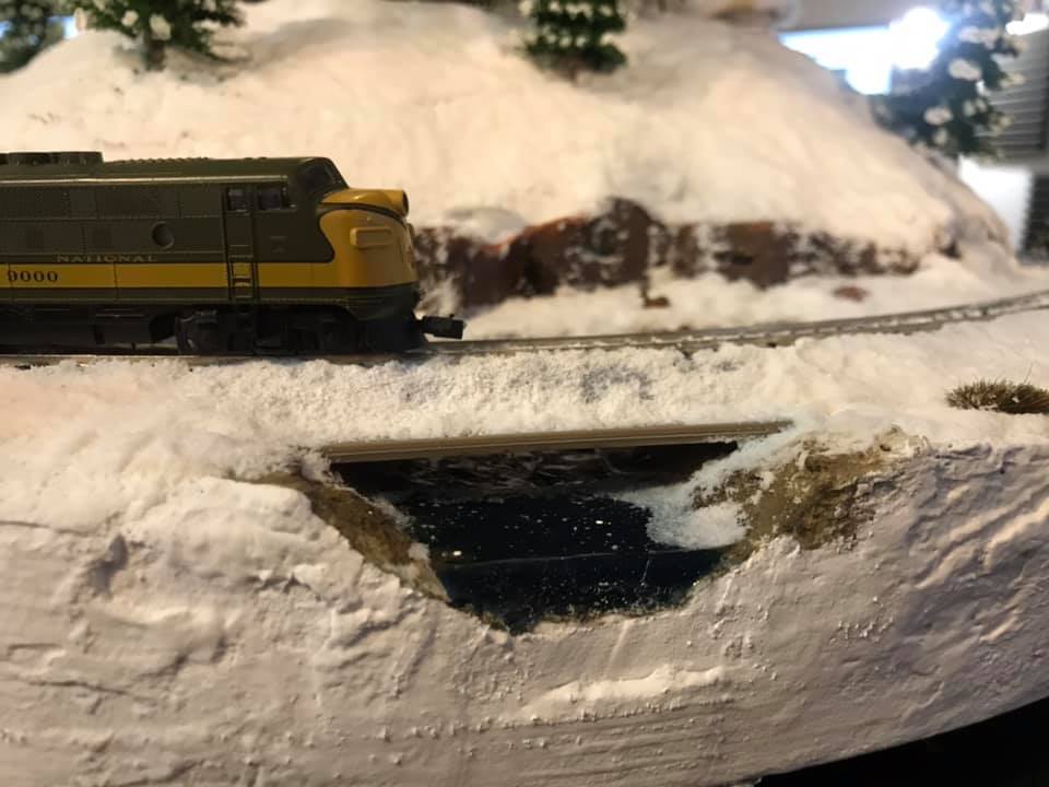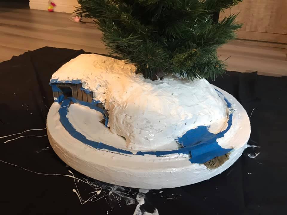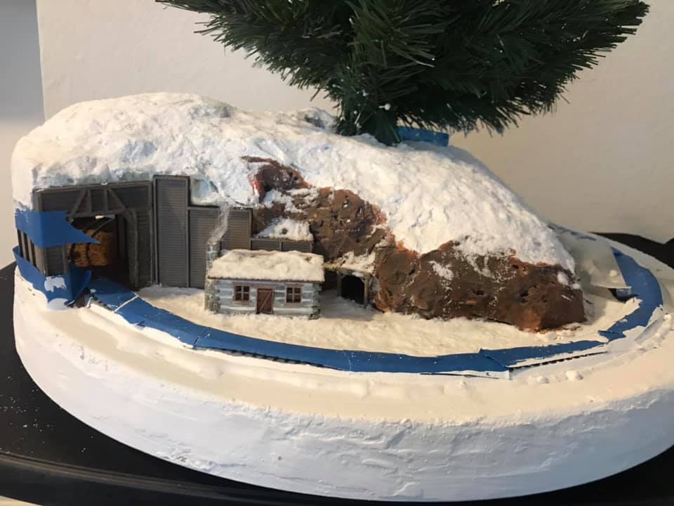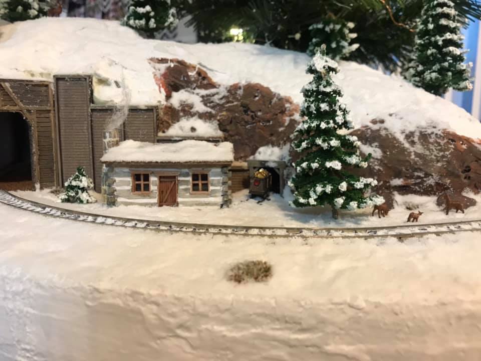 I don’t have too much space or a strong desire to put up a big tree for Christmas but I thought I should have something for the season! So I bought an 18 inch diameter wood base and a small fake Christmas tree to create a mountain snow scene with a little train that runs around it. If you look at the photos you can see some of the details I made which include a tunnel, a gold mine, some deer, a frozen creek, and a cabin. Originally I had the tree with no touch ups but I found that it did not match the rest of the scene so I simply painted the tree white with some downward strokes. I was surprised how well it all turned out.